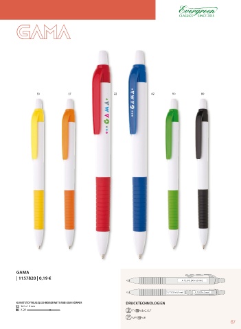 SINCE 2015 GAMA GAMA 10 17 22 42 50 80 GAMA | 1157820 | 0,19 € A: T1, UV1 [50 x 6,5 mm] C: T1 [15 x 6,5 mm] F: T1 [30 x 3 mm] KUNSTSTOFFKUGELSCHREIBER MIT FARBIGEM KÖRPER DRUCKTECHNOLOGIEN 141 x 10 mm X-20 • T1 A, B, C, G, F UV1 A, B 67